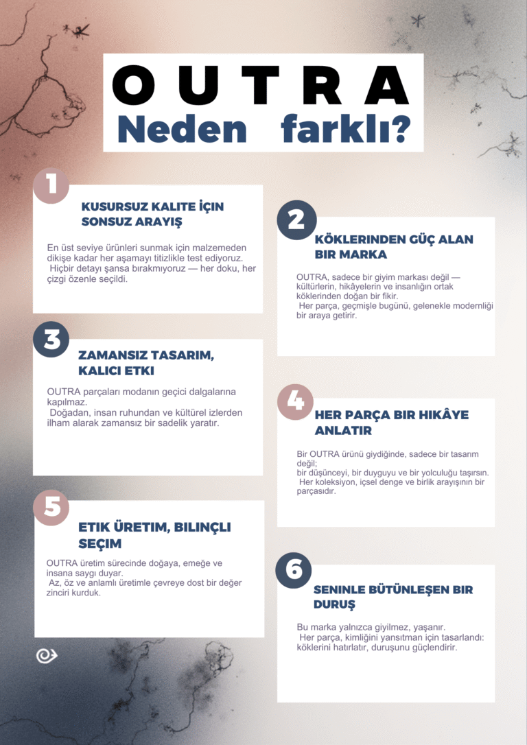 OUTRA, Görünmeyen Bağların Markası Her şey bir hikayeyle başlar. Bizim hikayemiz, doğanın ritmini, insanın emeğini ve düşüncenin gücünü yeniden birleştirme arzusuyla başladı. OUTRA, yalnızca bir marka değil; dünyaya daha bilinçli bakmanın, daha derin hissetmenin ve daha anlamlı üretmenin simgesidir. Biz, sürdürülebilirliği bir trend olarak değil, bir sorumluluk olarak görüyoruz. Her parça; doğadan alınan bir nefes, ustalığın izleriyle şekillenen bir fikir ve yaşanmış hikayelerden doğan bir anlam taşır. Ürettiğimiz her şey, daha az tüketmenin, daha çok hissetmenin bir yoludur. OUTRA, farklı bakışların, farklı kültürlerin ve farklı düşüncelerin kesişim noktasıdır. Her koleksiyon, bir hikayenin sessiz anlatıcısı; her çizgi, doğanın nabzını hisseden bir tasarımdır. Bizim için moda, giyilen bir şey değil — yaşanan bir hikayedir. Bu fikir; denge, bilinç, sadelik ve bağlantı üzerine kuruludur. Her detay, her dikiş, her desen bir anlam taşır. Çünkü biz inanıyoruz: gerçek güzellik, emekten ve farkındalıktan doğar.